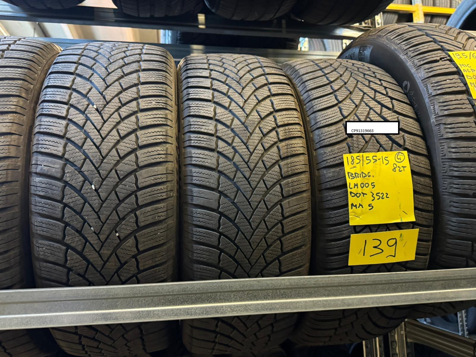 Marca e disegno pneumatici BRIDGESTONE BLIZZAK LM005. Misura, indice di carico, codice di velocità e marcature: 185/55 R 15 82 T. 5 millimetri residui di battistrada. Anno di produzione 2022 DOT (3522)
